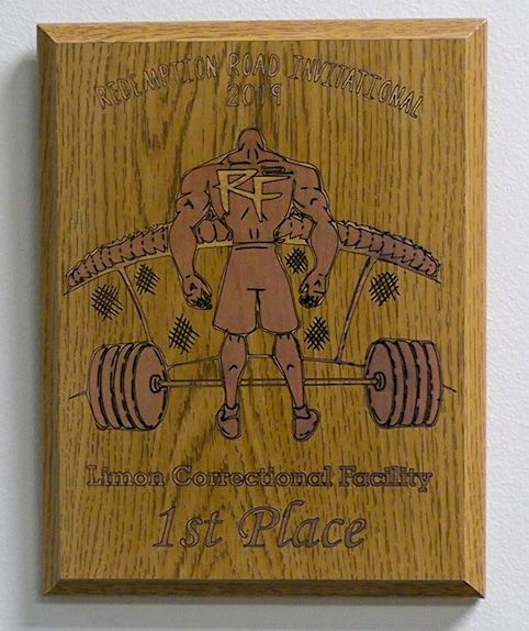 The Redemption Road CrossFit Trophy won by Chapin and Wells at a competition inside Limon Correctional Facility in Limon, CO, hangs in Chapin's office on Nov. 7, 2024. (Norah Hively, CU News Corps)