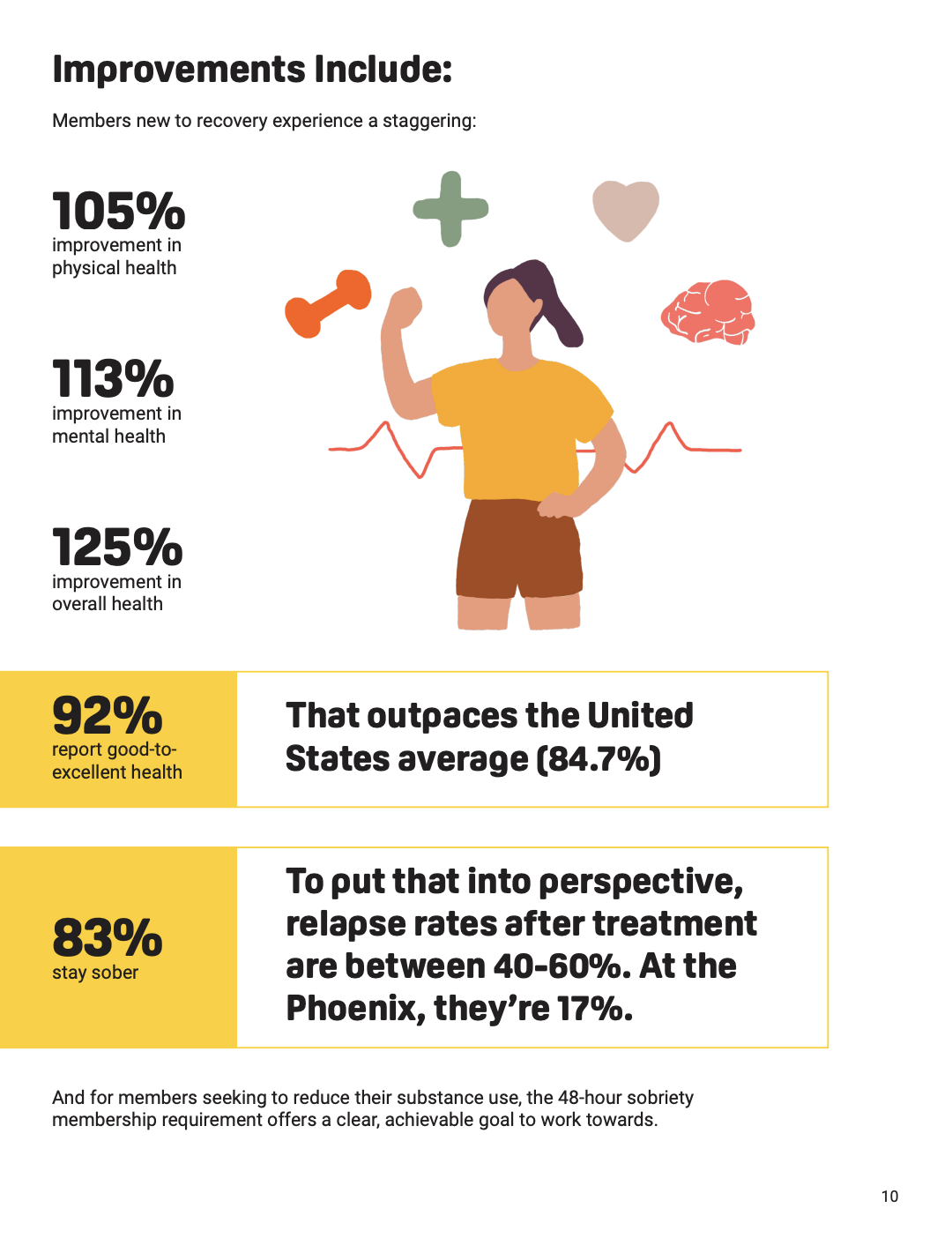 Page 10 of research findings on The Phoenix's website titled: "The Transformative Power of a Sober Active Community: An Accessible Approach to Healing" (2024). Presents how, in the first few months of joining, members statistically show health improvement.