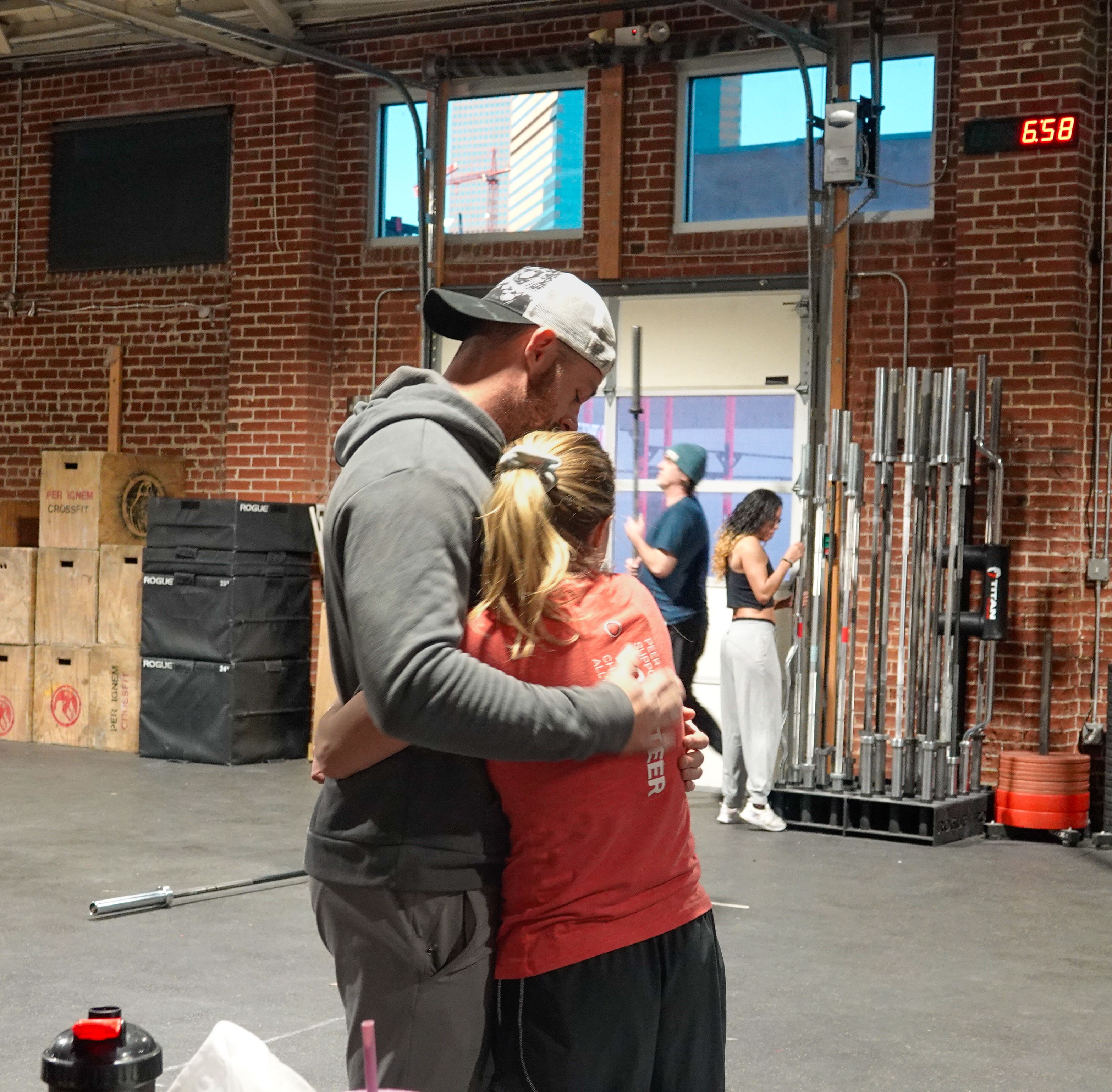Phoenix members hugging between workout sets during their early morning CrossFit class. Photo taken on Nov. 20, 2024, at The Phoenix-Denver. (Evanie Gamble, CU News Corps)