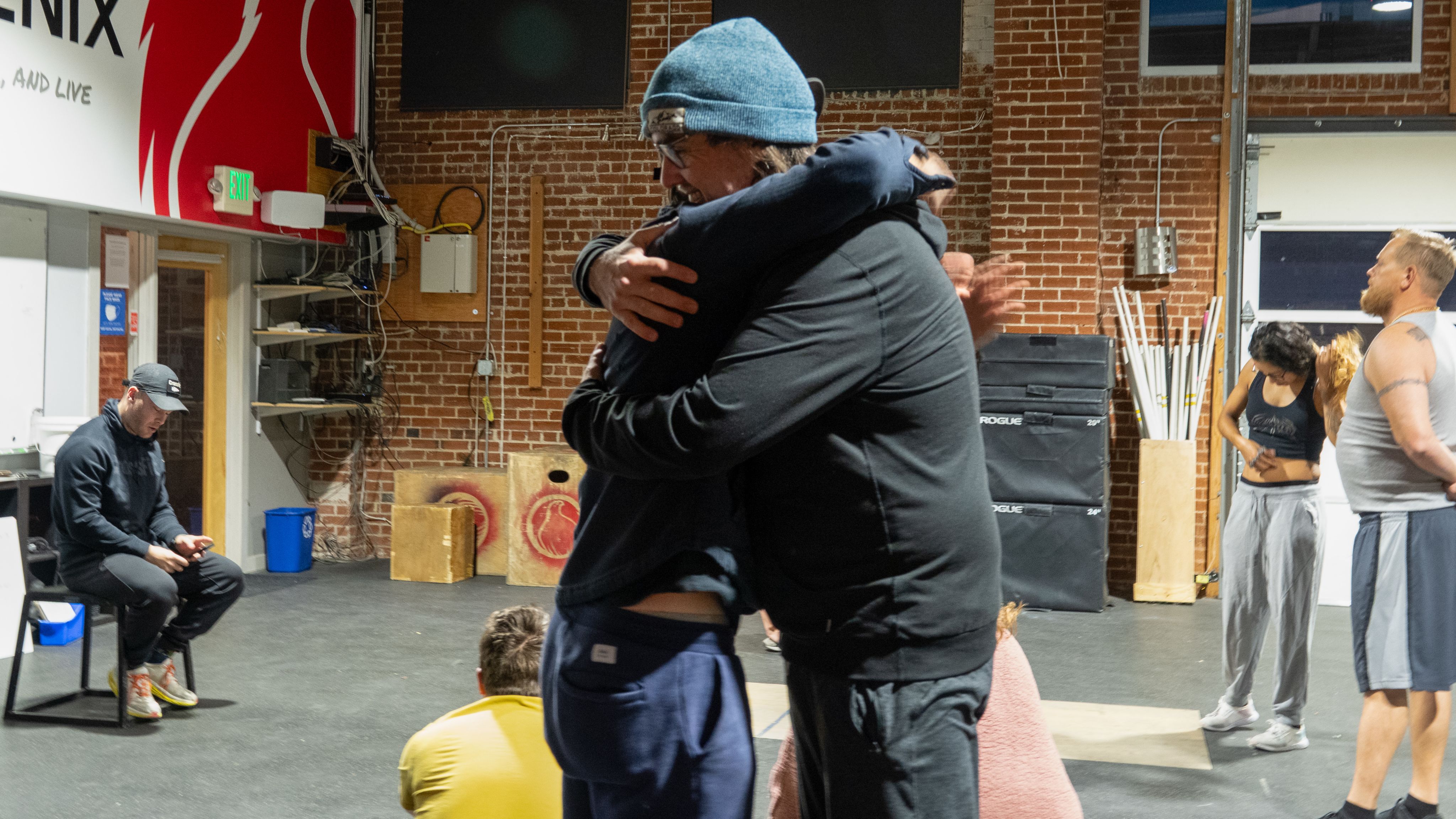 Phoenix members hugging before their morning CrossFit class on Wednesday, Nov. 20, 2024, at The Phoenix-Denver. (Evanie Gamble, CU News Corps)